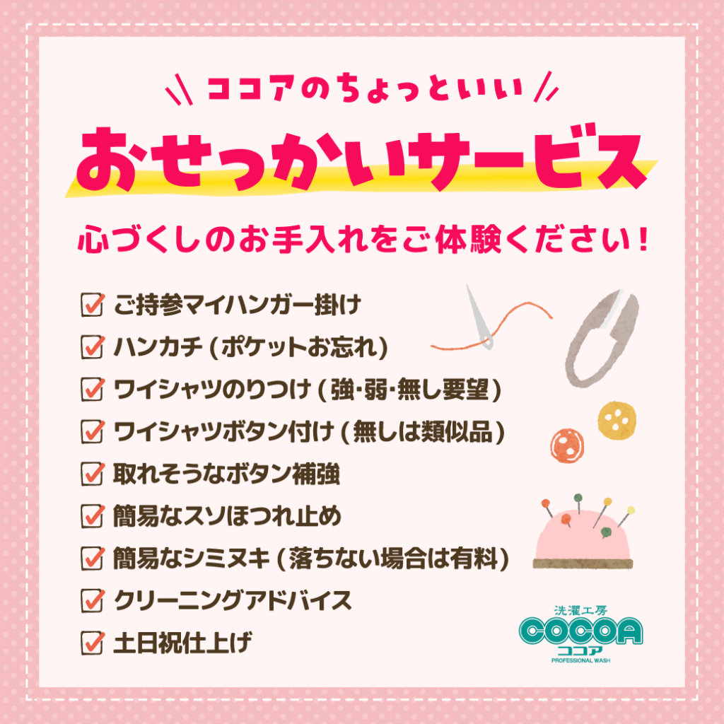 当店ではクリーニングするだけでなく、スタッフが一着ずつチェックして、緩んだボタンや小さな毛玉なども勝手にお直ししちゃう『おせっかい』なサービスを行っています。安心してお任せくださいね。