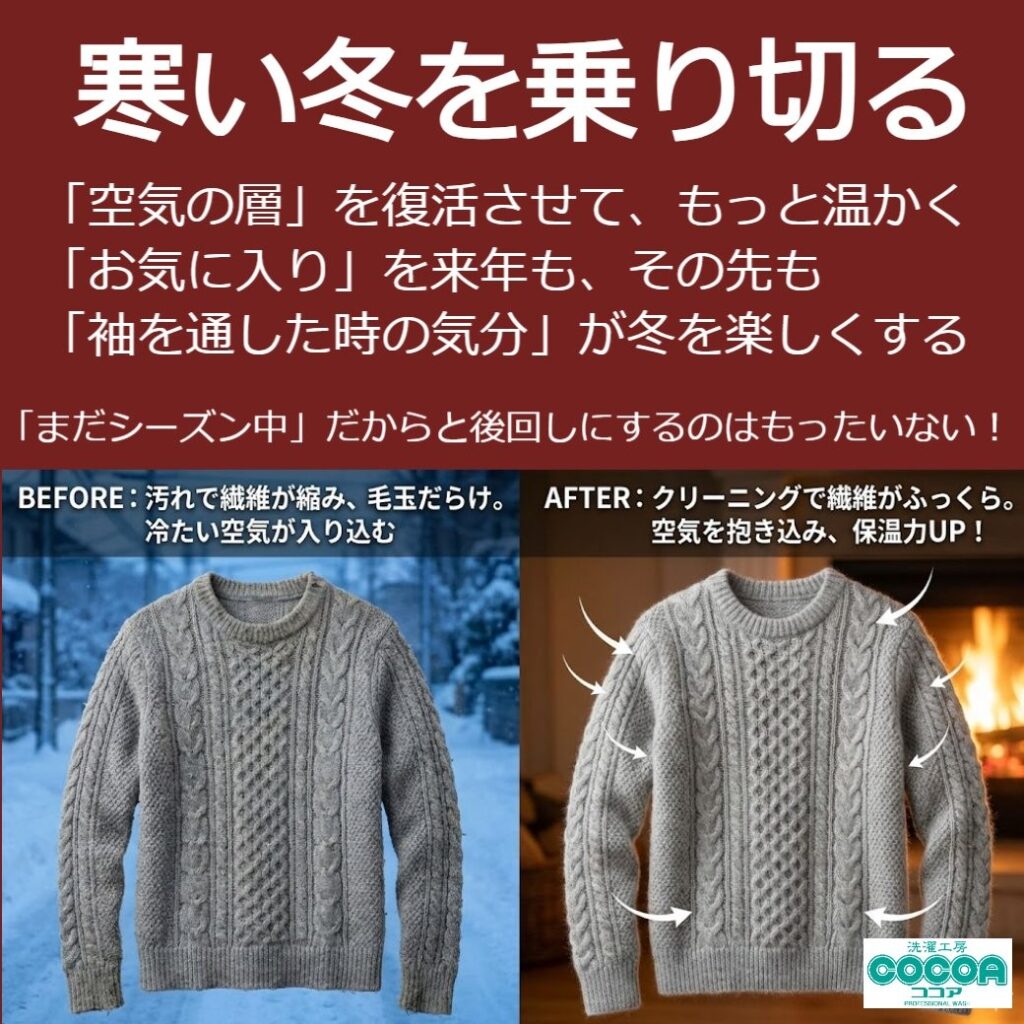 厳しい寒さが続く冬、毎日私たちを支えてくれるダウンジャケット・ウールのコートや必需品のニット。「とりあえず着られればいいか」と思われがちですが、実はクリーニングこそが「冬の温かさ」を最大化する鍵なんです。