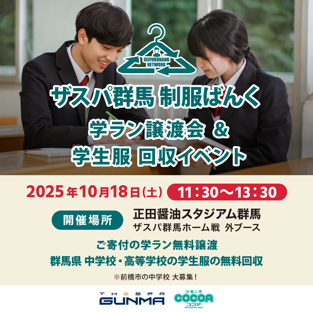 10/18「ザスパ群馬 制服ばんく 学ラン譲渡会&学生服回収イベント」開催です