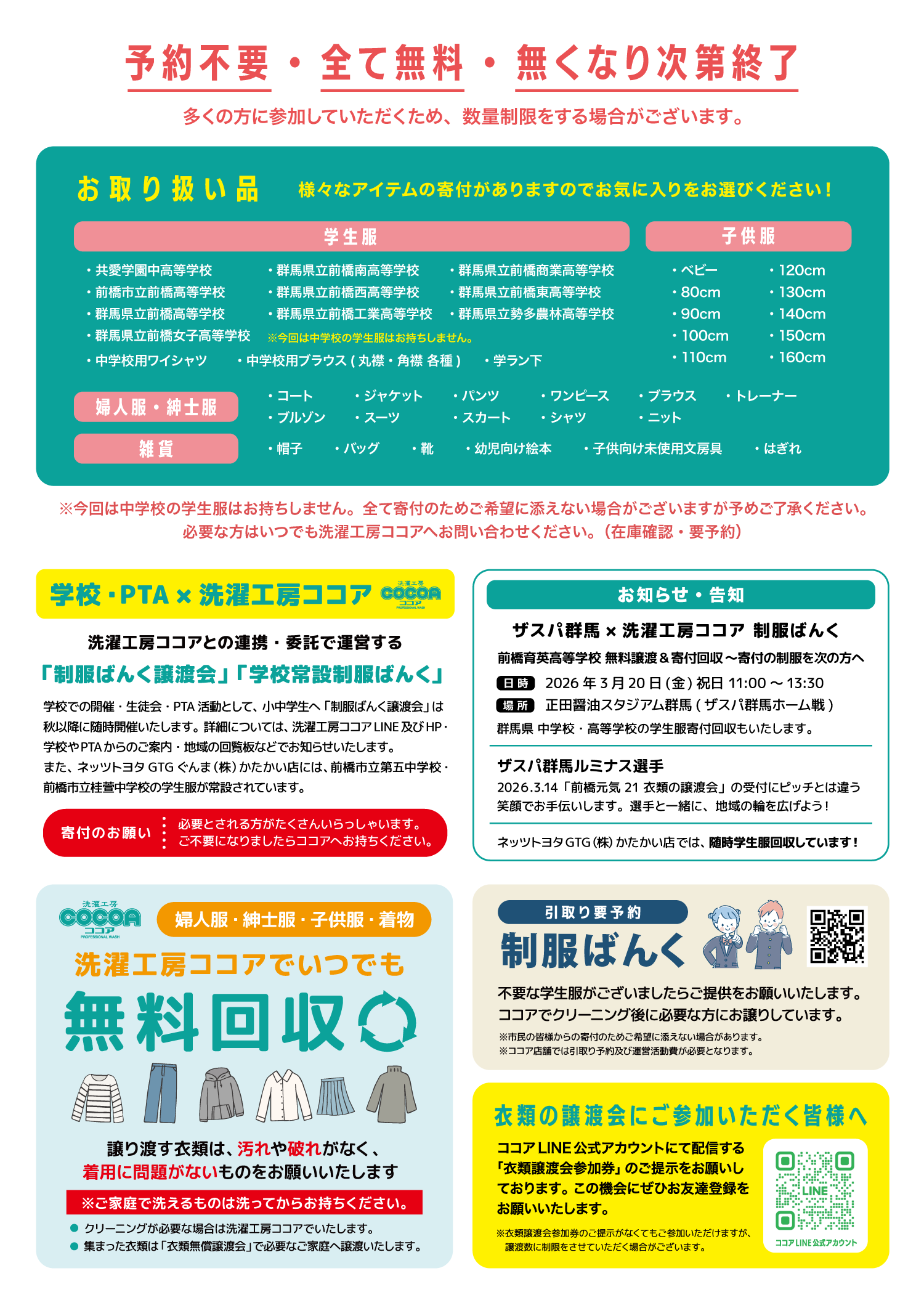 学校・PTA との連携で「制服ばんく譲渡会」を開催しています。ココアにも必要なご家庭がたくさん来店されています。ただいま、学ランや学生ワイシャツが不足していますので、どうぞご協力よろしくお願いします。
